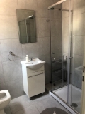 In dem modern gefliesten Bad befindet sich eine großzügige Dusche, ein Handwaschbecken und eine Toilette. Handtücher sind in ausreichender Menge vorhanden.